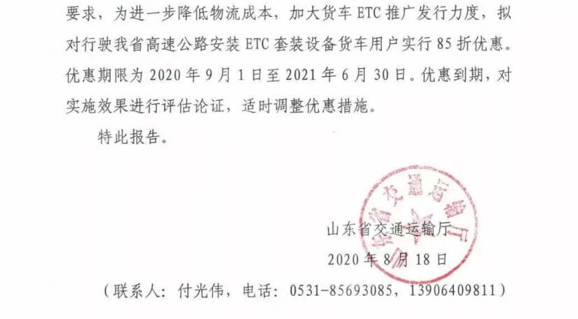 山東省表示:為進(jìn)一步降低物流成本,加大貨車ETC推廣發(fā)行力度,擬對行駛在山東省高速安裝ETC套裝設(shè)備貨車用戶實(shí)行85折優(yōu)惠,期限為2020年9月1日至2021年6月30日。