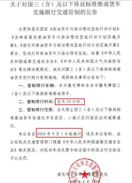 管制限行范圍:全天禁止國三(含)及以下排放標(biāo)準(zhǔn)柴油貨車在通化市東昌區(qū)、二道江區(qū)行政區(qū)劃內(nèi)道路通行。